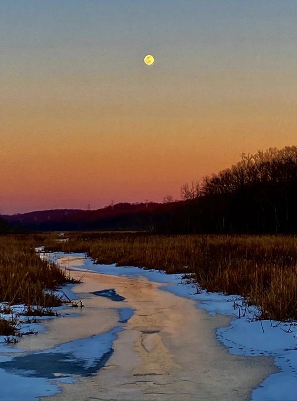 This photograph, “Moon Rising,” was a fortuitous opportunity. The moon  reflected the sunset’s golden hue and thus appeared yellow, rather than  white.